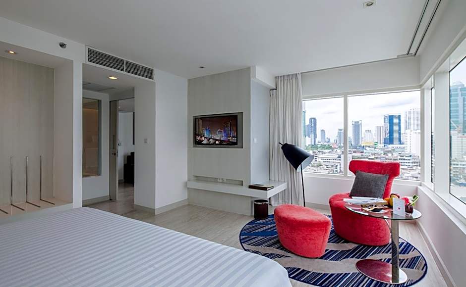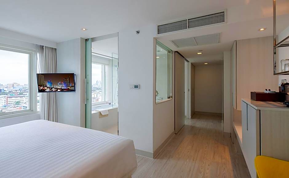 Spacious suite with living room and bedroom. It offers 1 king bed, 1 sofa bed, bathtub and DVD player.